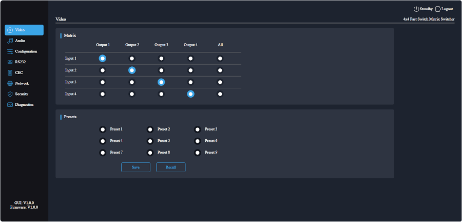 • รองรับการควบคุมผ่านปุ่มกด, IR, RS-232 หรือ TCP/IP (Web-GUI)